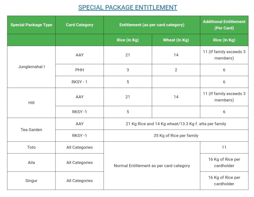 AAY, PHH ও RKSY I এই সমস্ত শ্রেণীর রেশন গ্রাহকদের জন্যে চাল ও গম ও আটার পরিমাণ কার্ডের বিভাগ অনুযায়ী রাখা হয়েছে। শুধুমাত্র টোটো সম্প্রদায়ের জন্য অতিরিক্ত ১১ কেজি চাল এবং সিঙ্গুর ও আইলা সম্প্রদায়ের জন্য অতিরিক্ত ১৬ কেজি চাল বরাদ্দ করা হয়েছে। August Month Ration List 2024