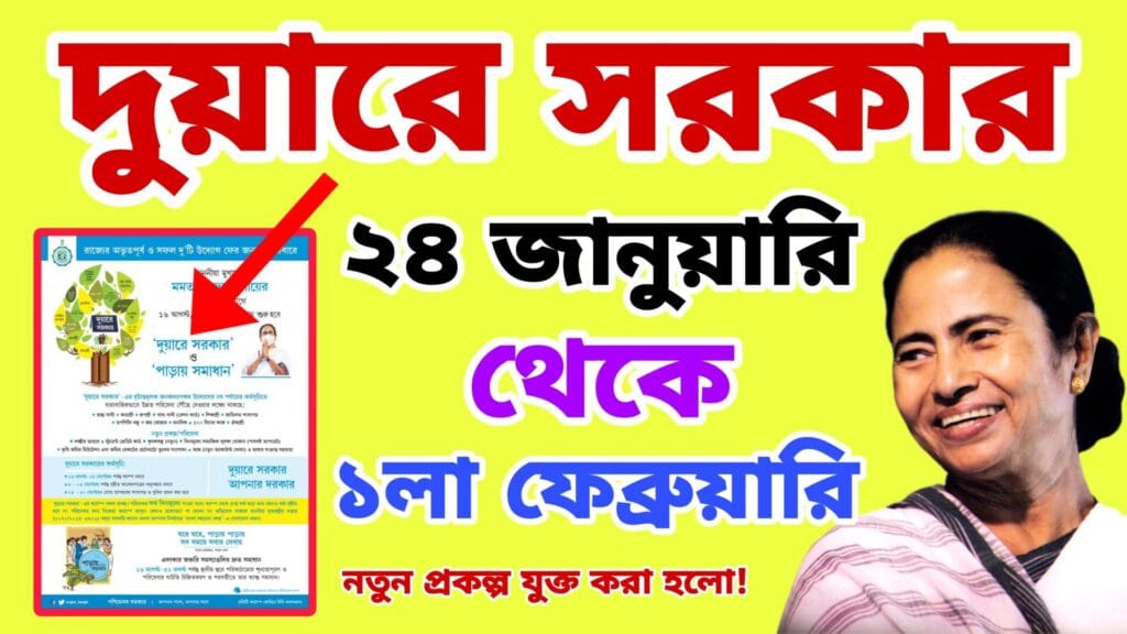 নবান্নের তরফ থেকে জারি করা বিজ্ঞপ্তি থেকে জানা যাচ্ছে, আগামী 24 January থেকে সরকারি অফিসাররা রাজ্যের প্রত্যন্ত এলাকায় ‘‌দুয়ারে সরকার’‌ কর্মসূচি নিয়ে পৌঁছে দেবেন। এর জন্য সোমবার থেকে প্রস্তুতি নেওয়া হবে। এবারও বাংলার সাধারণ মানুষজন লক্ষ্মীর ভান্ডার, খাদ্যসাথী, স্বাস্থ্যসাথী–সহ বিভিন্ন প্রকল্প পাবেন।